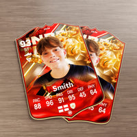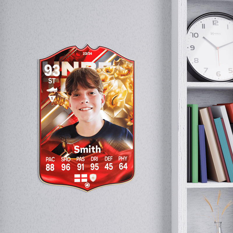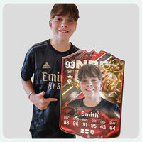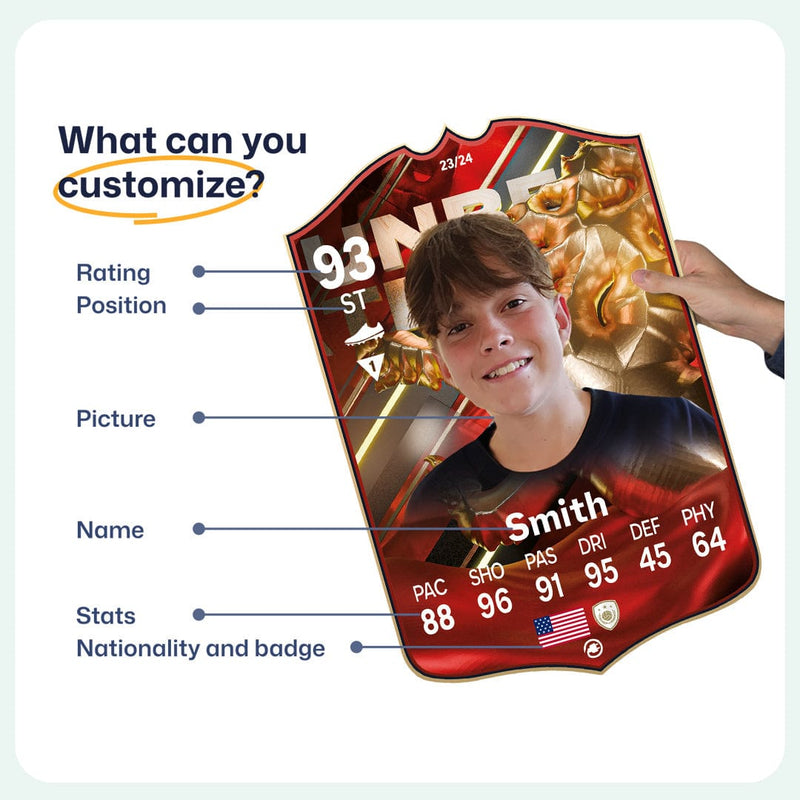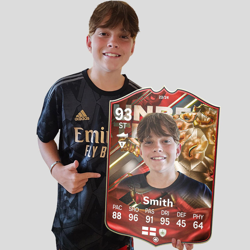 When it comes to personalising your card, the basic steps are to upload a photo and add a name to your card. Then you’ll add details like your player’s position and skill ratings out of 99 for each football skill shown on the card. Our online card builder makes this really easy. And if you aren’t a football card expert, don’t worry!