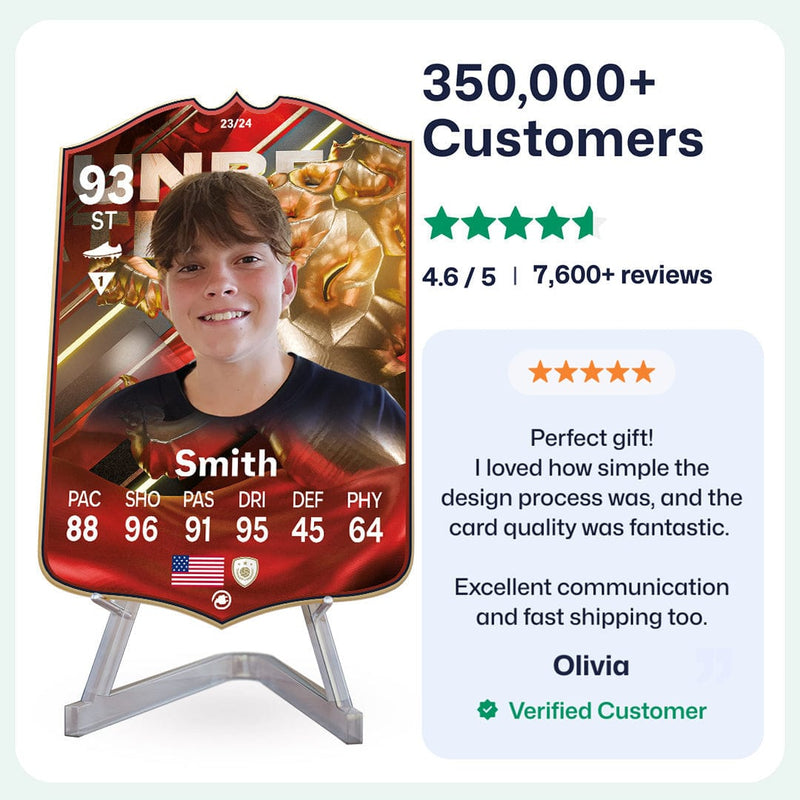 Yes! Our football card designers will remove the background from the photo you upload so it looks just like the football cards you might’ve seen games like EA FC 25, EA FC 24 or FIFA. We’ll also position the photo perfectly on the football card so it looks great. If there are any problems with the quality of your photo, we’ll reach out and let you know. Plus, our website's AI will remove the background on the image for visual purposes before purchase so you can see it without a background on the card.