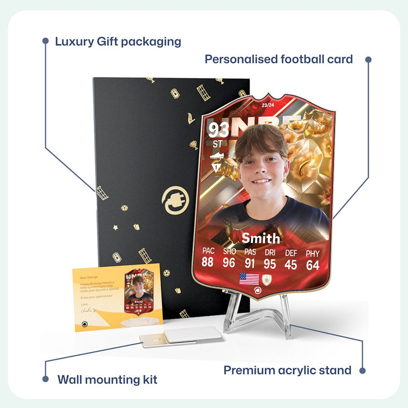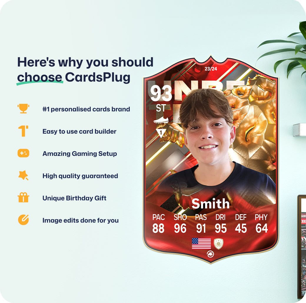 CardsPlug is home to the world’s favourite personalised football cards. Our easy football card builder lets you make a real life football card with your own name, photo, and skill ratings. With 100+ designs to choose from and some inspired by EA SPORTS FC 26 cards seen in EA FC 26, EA FC 25 and FC 24 as well as FIFA cards seen in games like FIFA 23 and FIFA 22.
