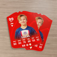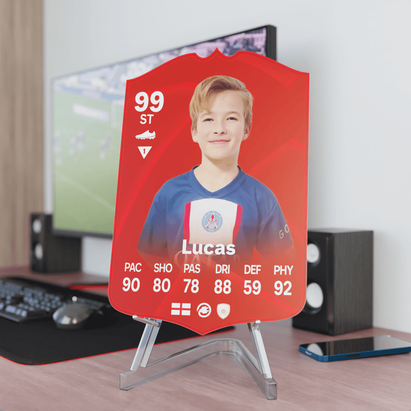 When it comes to personalising your card, the basic steps are to upload a photo and add a name to your card. Then you’ll add details like your player’s position and skill ratings out of 99 for each football skill shown on the card. Our online card builder makes this really easy. And if you aren’t a football card expert, don’t worry!