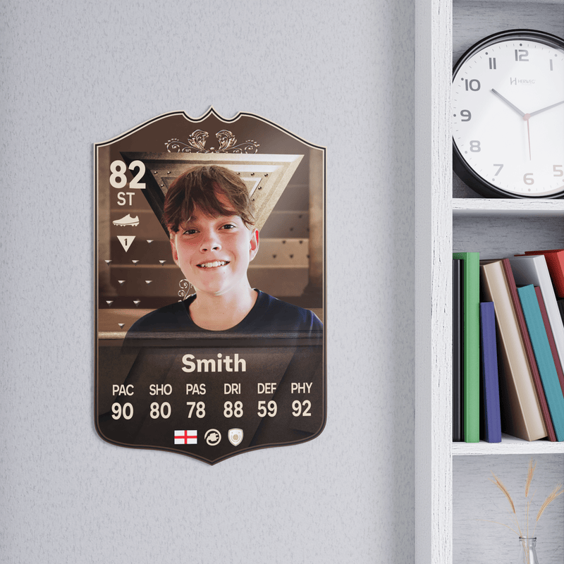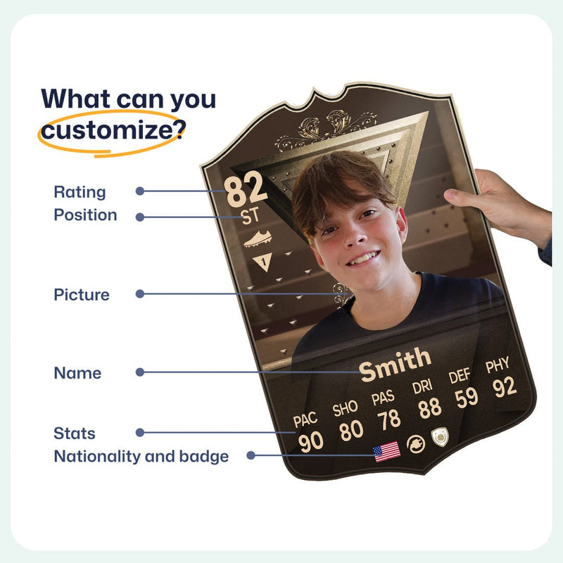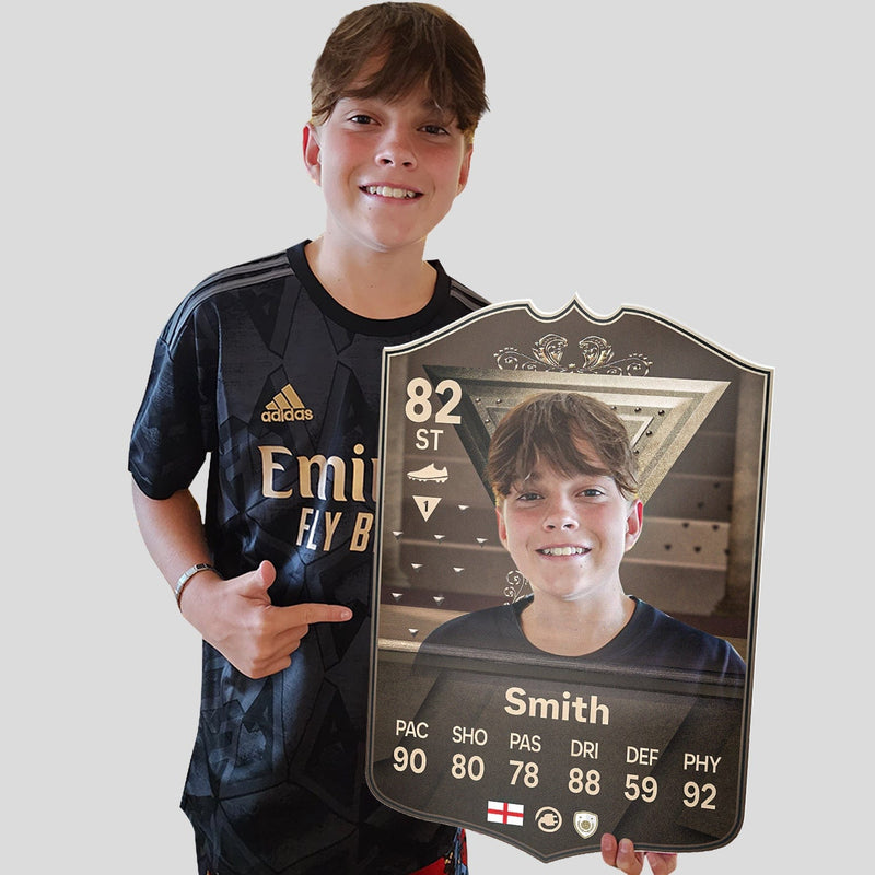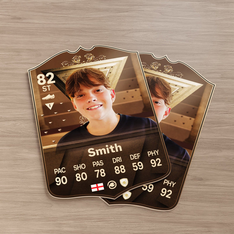 When it comes to personalising your card, the basic steps are to upload a photo and add a name to your card. Then you’ll add details like your player’s position and skill ratings out of 99 for each football skill shown on the card. Our online card builder makes this really easy. And if you aren’t a football card expert, don’t worry!
