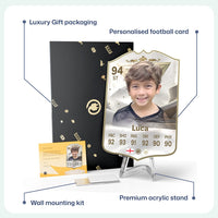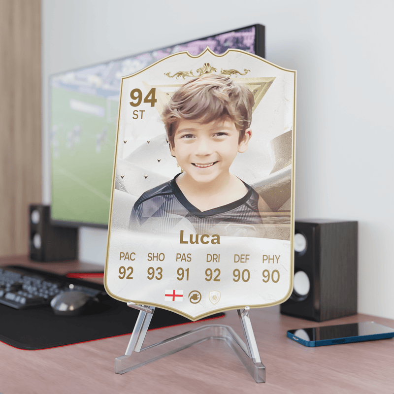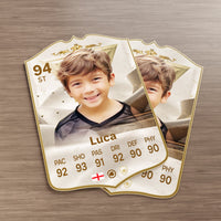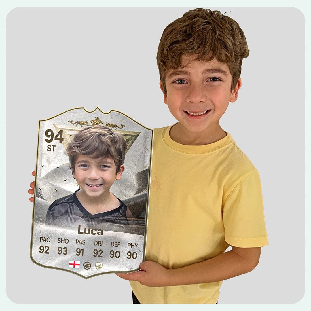 When it comes to personalising your card, the basic steps are to upload a photo and add a name to your card. Then you’ll add details like your player’s position and skill ratings out of 99 for each football skill shown on the card. Our online card builder makes this really easy. And if you aren’t a football card expert, don’t worry!