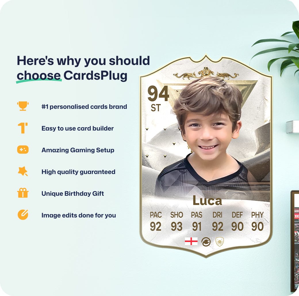 CardsPlug is home to the world’s favourite personalised football cards. Our easy football card builder lets you make a real life football card with your own name, photo, and skill ratings. With 100+ designs to choose from and some inspired by EA SPORTS FC 26 cards seen in EA FC 26, EA FC 25 and FC 24 as well as FIFA cards seen in games like FIFA 23 and FIFA 22.