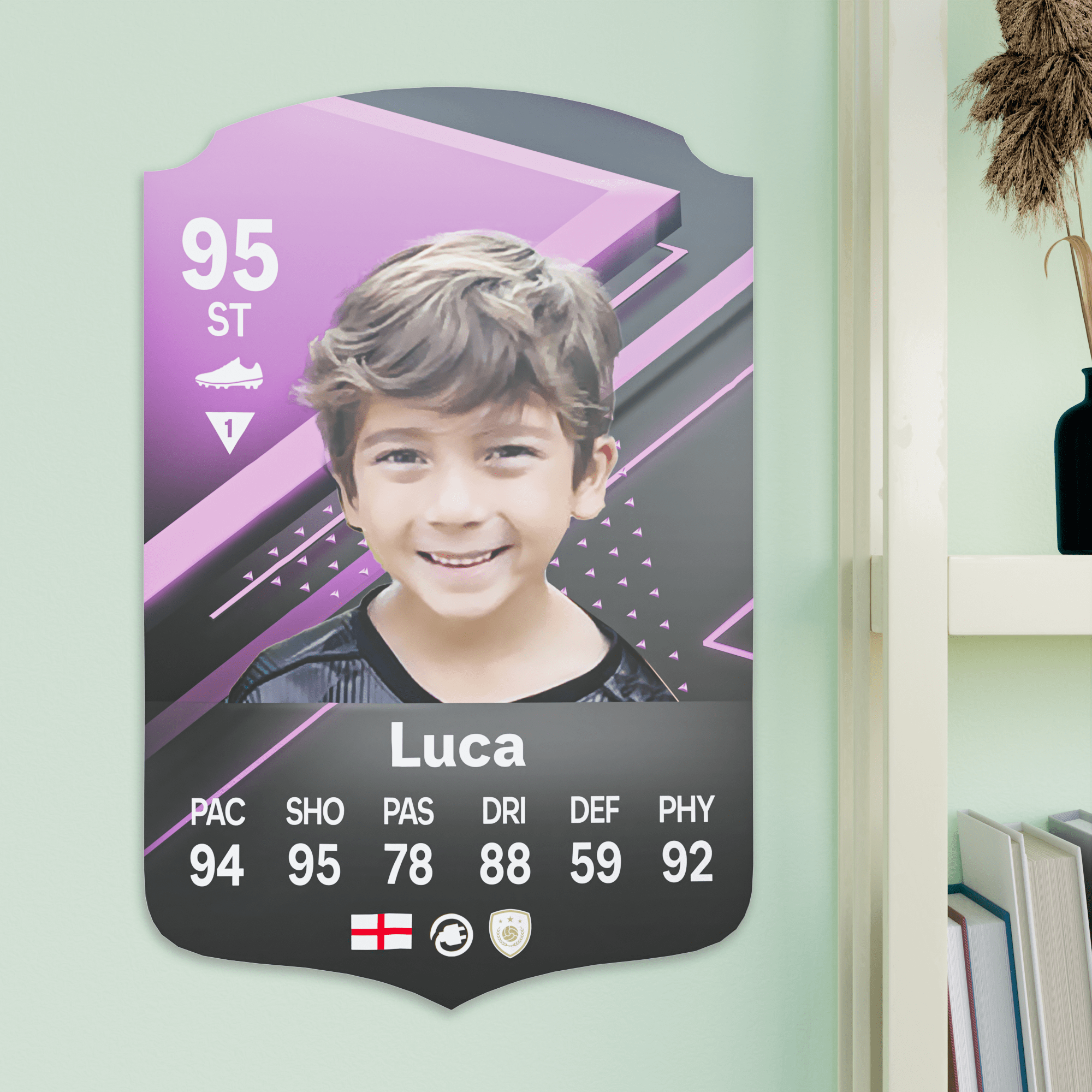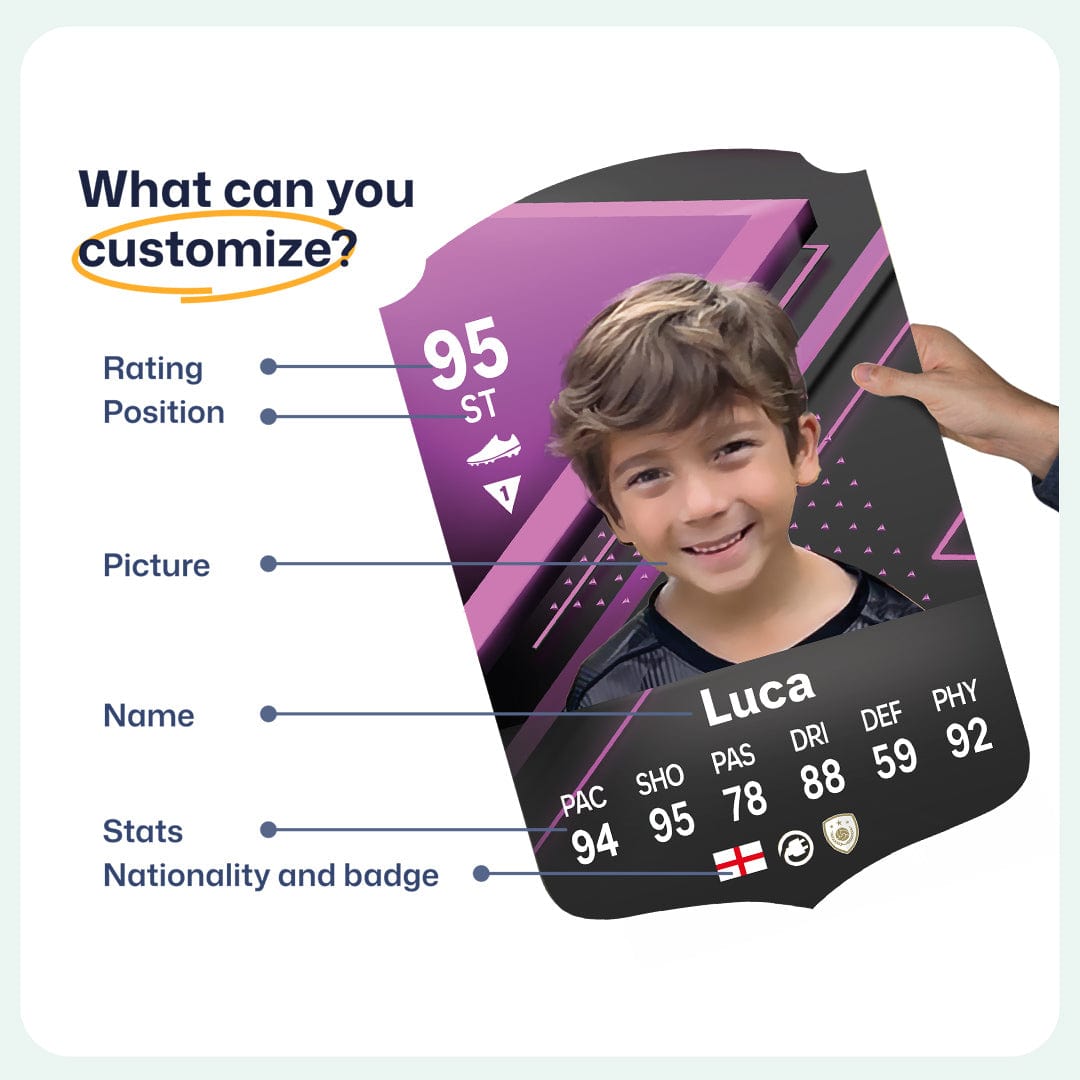 When it comes to personalising your card, the basic steps are to upload a photo and add a name to your card. Then you’ll add details like your player’s position and skill ratings out of 99 for each football skill shown on the card. Our online card builder makes this really easy. And if you aren’t a football card expert, don’t worry!