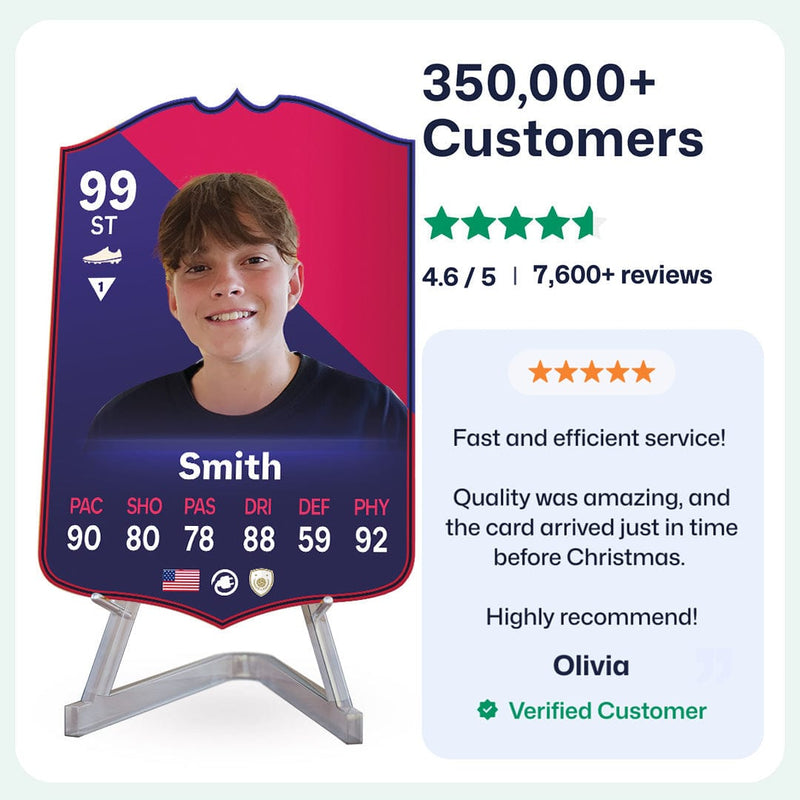 Yes! Our football card designers will remove the background from the photo you upload so it looks just like the football cards you might’ve seen games like EA FC 25, EA FC 24 or FIFA. We’ll also position the photo perfectly on the football card so it looks great. If there are any problems with the quality of your photo, we’ll reach out and let you know. Plus, our website's AI will remove the background on the image for visual purposes before purchase so you can see it without a background on the card.