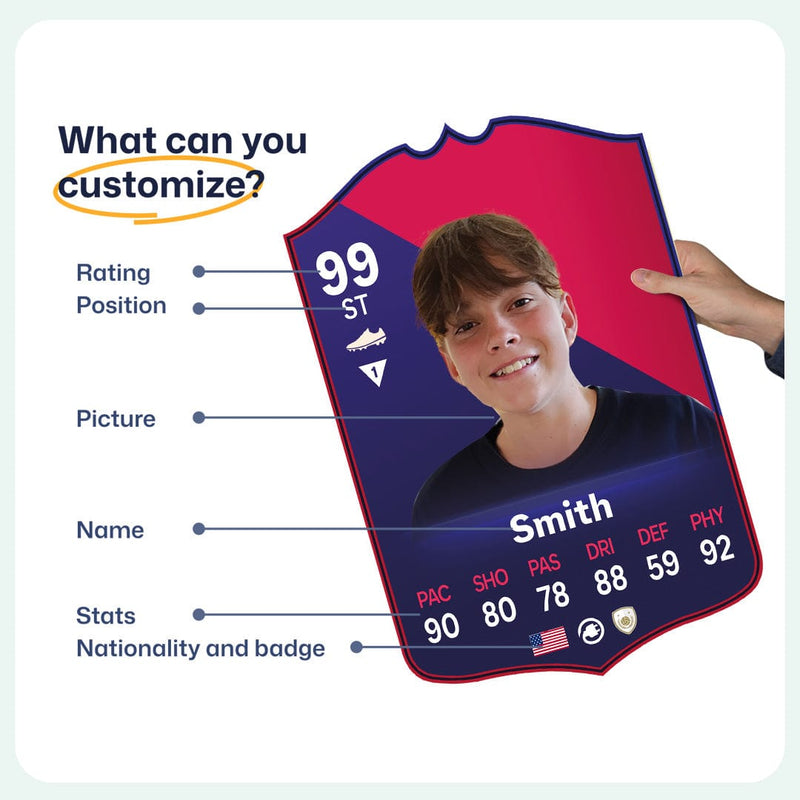 When it comes to personalising your card, the basic steps are to upload a photo and add a name to your card. Then you’ll add details like your player’s position and skill ratings out of 99 for each football skill shown on the card. Our online card builder makes this really easy. And if you aren’t a football card expert, don’t worry!