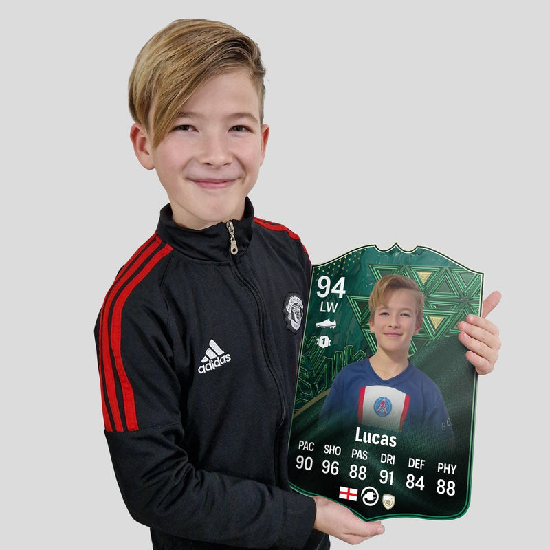 When it comes to personalising your card, the basic steps are to upload a photo and add a name to your card. Then you’ll add details like your player’s position and skill ratings out of 99 for each football skill shown on the card. Our online card builder makes this really easy. And if you aren’t a football card expert, don’t worry!