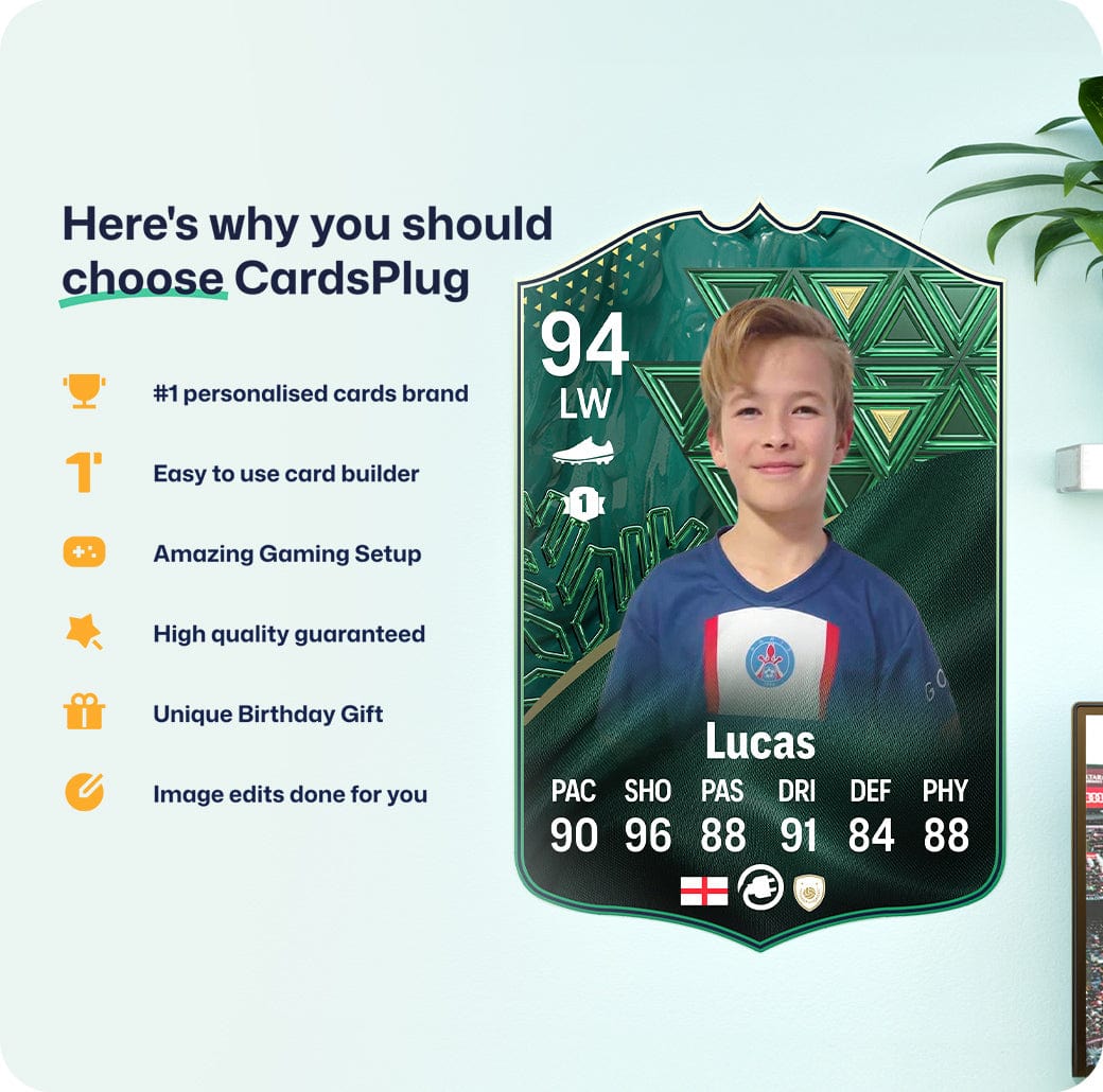CardsPlug is home to the world’s favourite personalised football cards. Our easy football card builder lets you make a real life football card with your own name, photo, and skill ratings. With 100+ designs to choose from and some inspired by EA SPORTS FC 26 cards seen in EA FC 26, EA FC 25 and FC 24 as well as FIFA cards seen in games like FIFA 23 and FIFA 22.