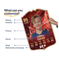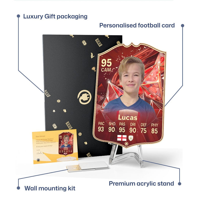 When it comes to personalising your card, the basic steps are to upload a photo and add a name to your card. Then you’ll add details like your player’s position and skill ratings out of 99 for each football skill shown on the card. Our online card builder makes this really easy. And if you aren’t a football card expert, don’t worry!