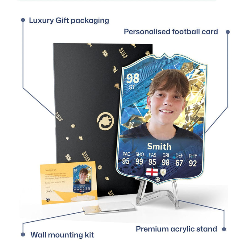 When it comes to personalising your card, the basic steps are to upload a photo and add a name to your card. Then you’ll add details like your player’s position and skill ratings out of 99 for each football skill shown on the card. Our online card builder makes this really easy. And if you aren’t a football card expert, don’t worry!