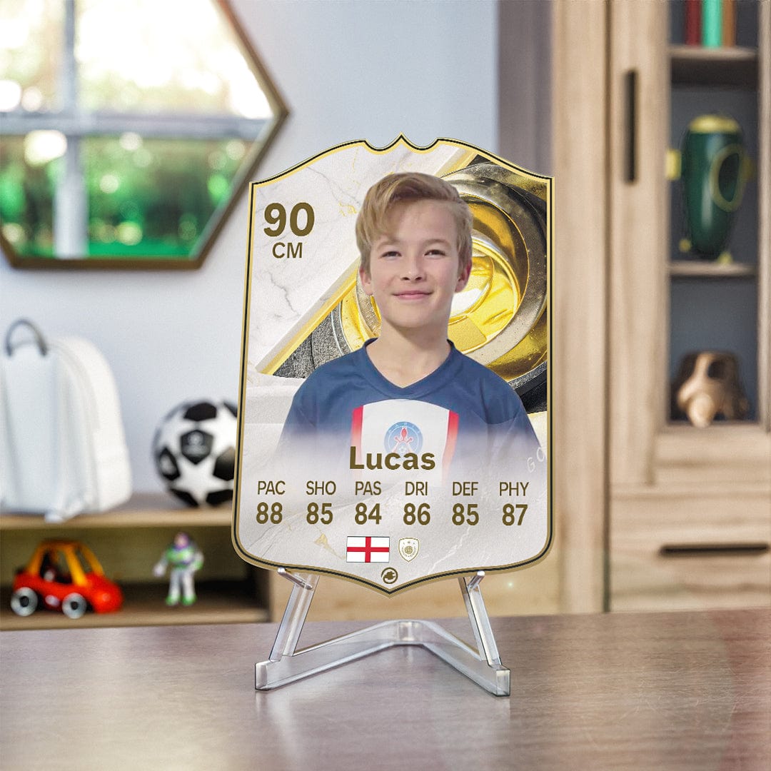 When it comes to personalising your card, the basic steps are to upload a photo and add a name to your card. Then you’ll add details like your player’s position and skill ratings out of 99 for each football skill shown on the card. Our online card builder makes this really easy. And if you aren’t a football card expert, don’t worry!