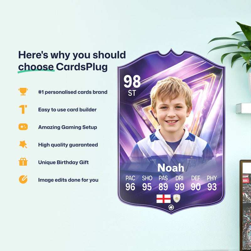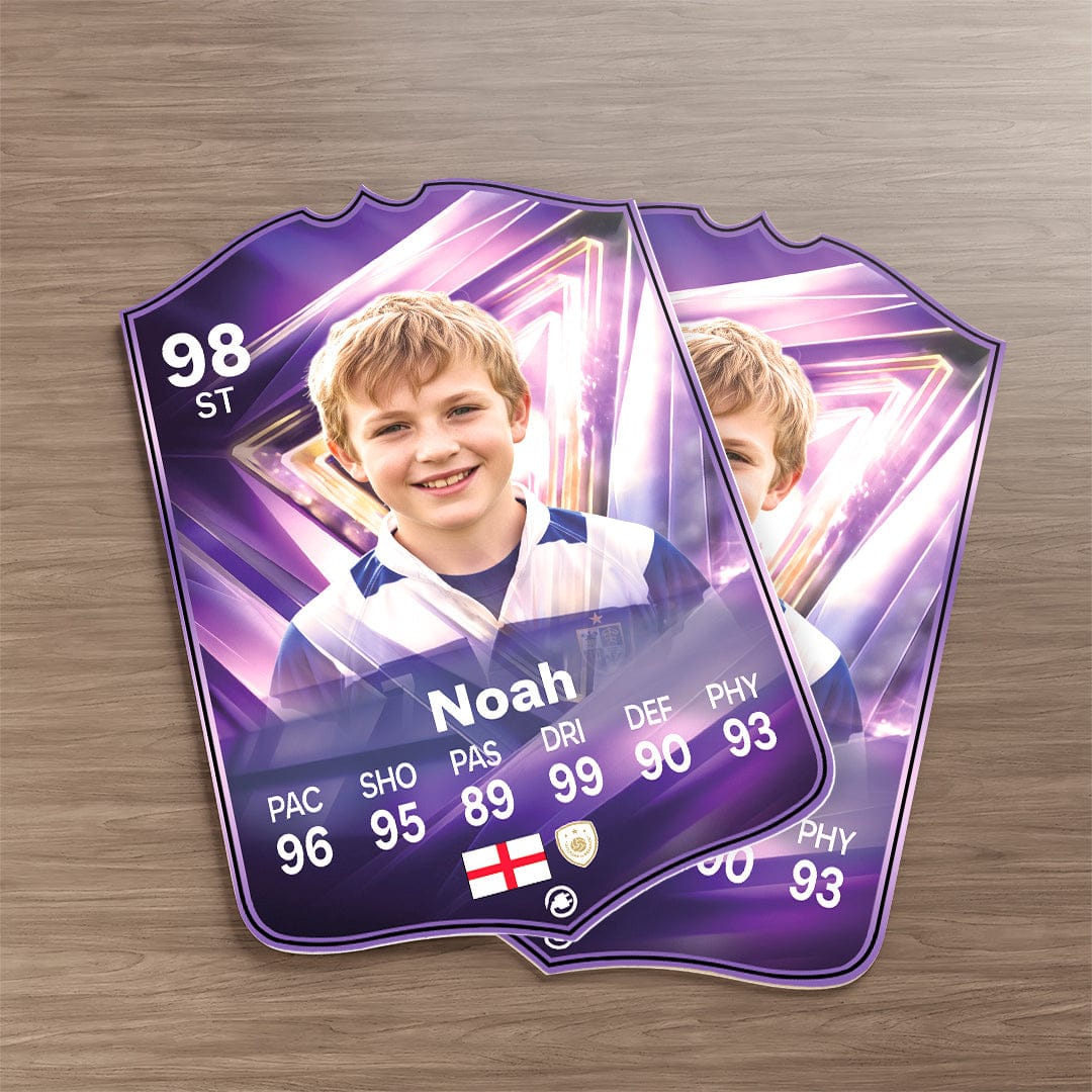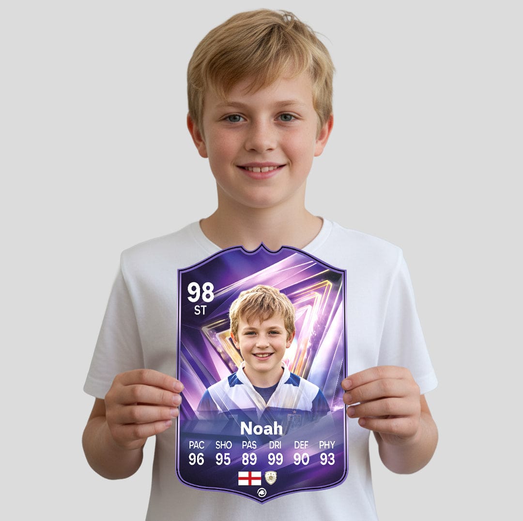 CardsPlug is home to the world’s favourite personalised football cards. Our easy football card builder lets you make a real life football card with your own name, photo, and skill ratings. With 100+ designs to choose from and some inspired by EA SPORTS FC 26 cards seen in EA FC 26, EA FC 25 and FC 24 as well as FIFA cards seen in games like FIFA 23 and FIFA 22.