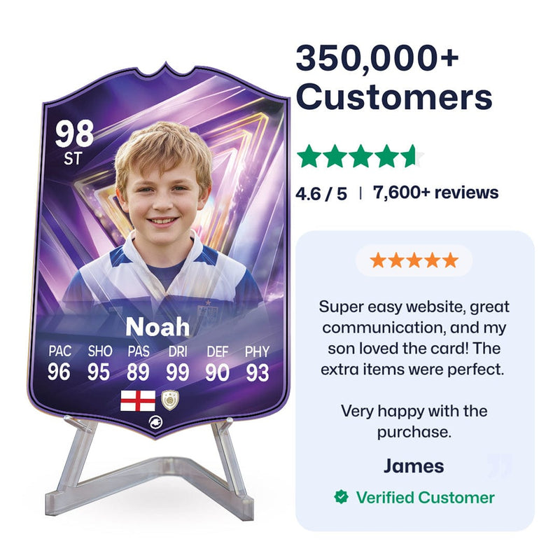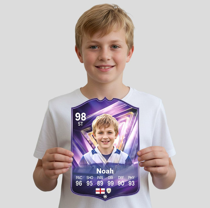 Yes! Our football card designers will remove the background from the photo you upload so it looks just like the football cards you might’ve seen games like EA FC 25, EA FC 24 or FIFA. We’ll also position the photo perfectly on the football card so it looks great. If there are any problems with the quality of your photo, we’ll reach out and let you know. Plus, our website's AI will remove the background on the image for visual purposes before purchase so you can see it without a background on the card.