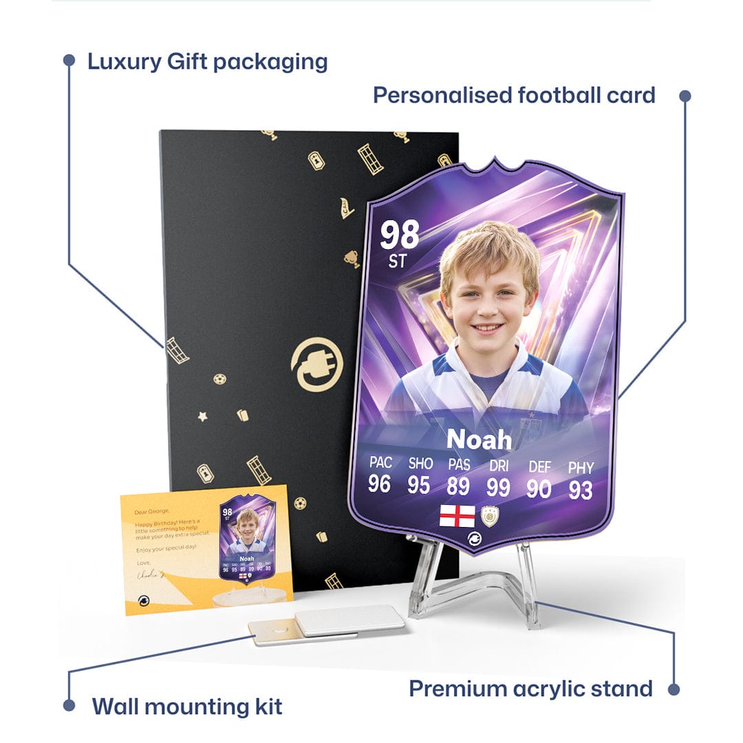 When it comes to personalising your card, the basic steps are to upload a photo and add a name to your card. Then you’ll add details like your player’s position and skill ratings out of 99 for each football skill shown on the card. Our online card builder makes this really easy. And if you aren’t a football card expert, don’t worry!