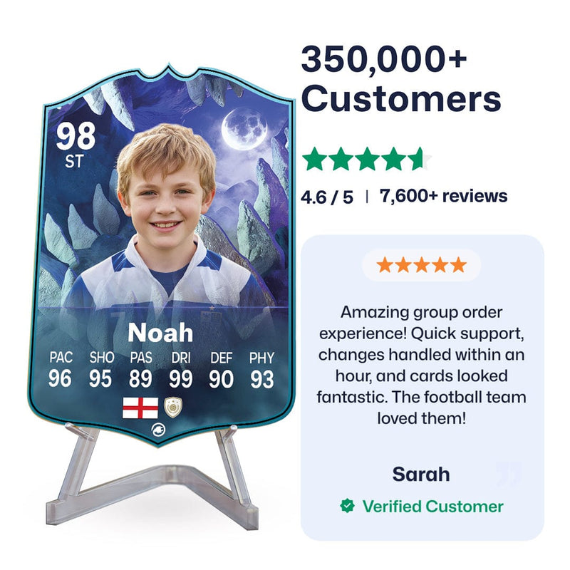 Yes! Our football card designers will remove the background from the photo you upload so it looks just like the football cards you might’ve seen games like EA FC 25, EA FC 24 or FIFA. We’ll also position the photo perfectly on the football card so it looks great. If there are any problems with the quality of your photo, we’ll reach out and let you know. Plus, our website's AI will remove the background on the image for visual purposes before purchase so you can see it without a background on the card.