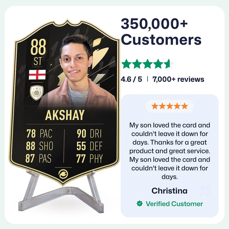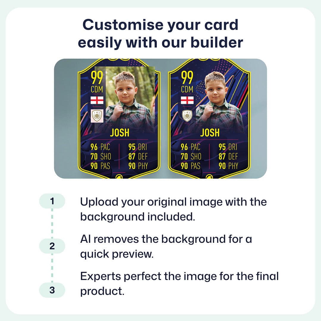 Yes! Our football card designers will remove the background from the photo you upload so it looks just like the football cards you might’ve seen games like EA FC 25, EA FC 24 or FIFA. We’ll also position the photo perfectly on the football card so it looks great. If there are any problems with the quality of your photo, we’ll reach out and let you know. Plus, our website's AI will remove the background on the image for visual purposes before purchase so you can see it without a background on the card.