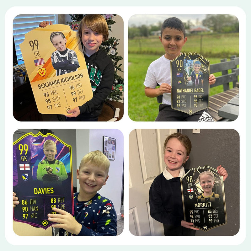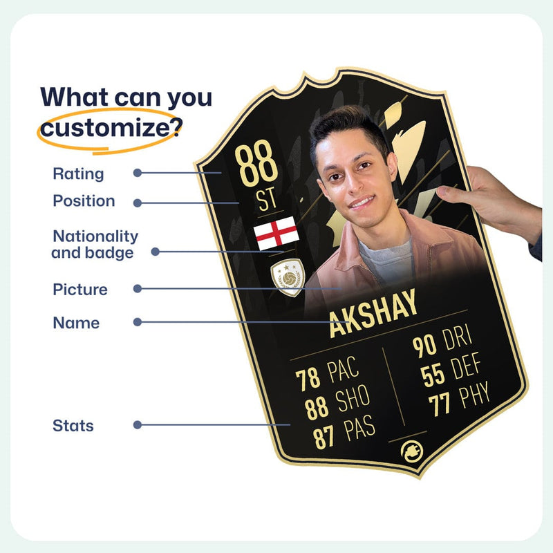 When it comes to personalising your card, the basic steps are to upload a photo and add a name to your card. Then you’ll add details like your player’s position and skill ratings out of 99 for each football skill shown on the card. Our online card builder makes this really easy. And if you aren’t a football card expert, don’t worry!