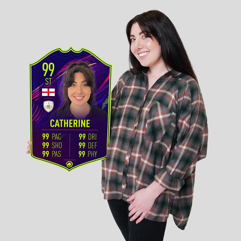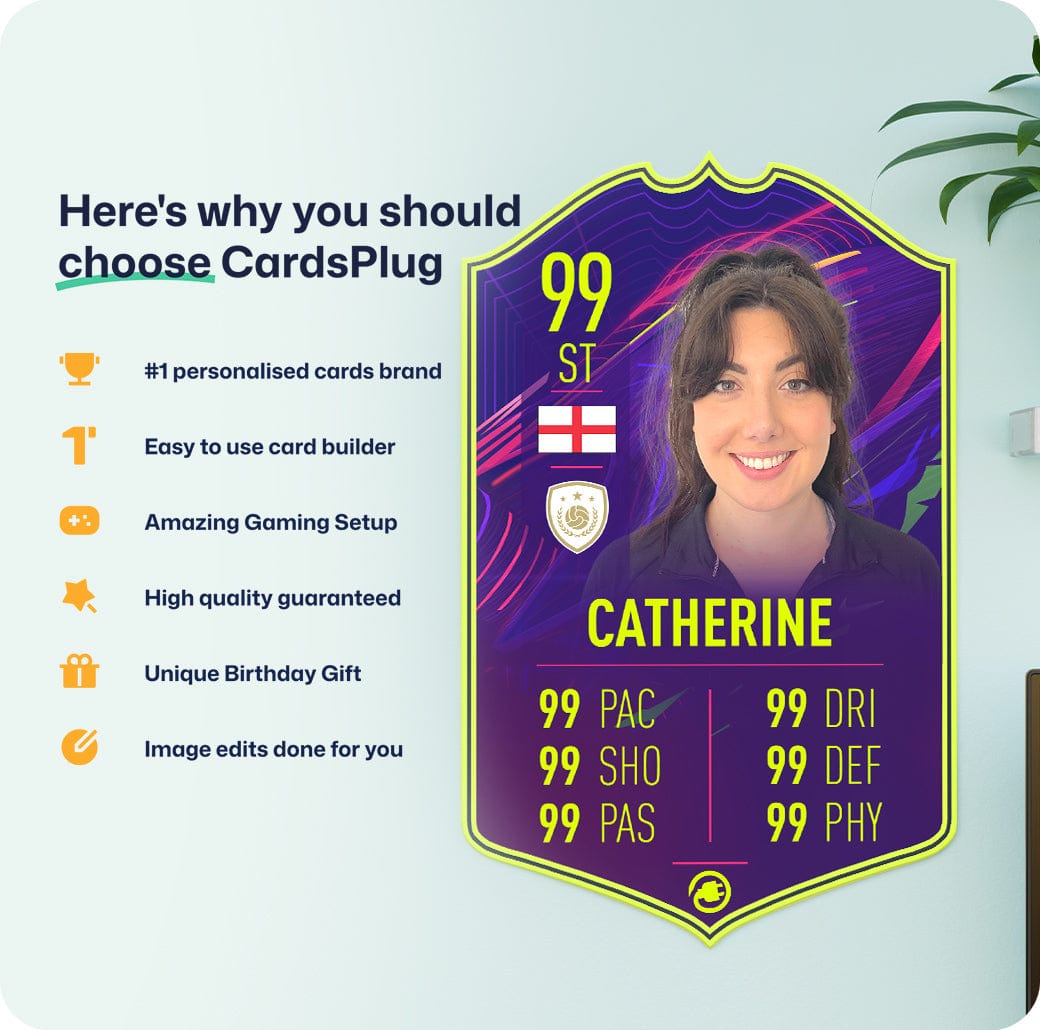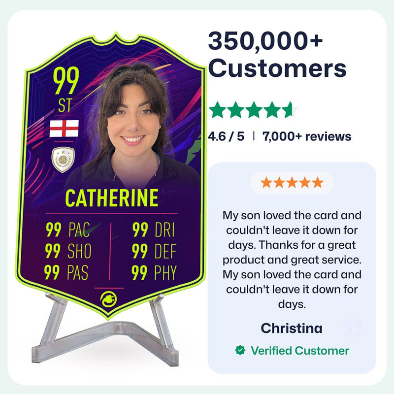 When it comes to personalising your card, the basic steps are to upload a photo and add a name to your card. Then you’ll add details like your player’s position and skill ratings out of 99 for each football skill shown on the card. Our online card builder makes this really easy. And if you aren’t a football card expert, don’t worry!