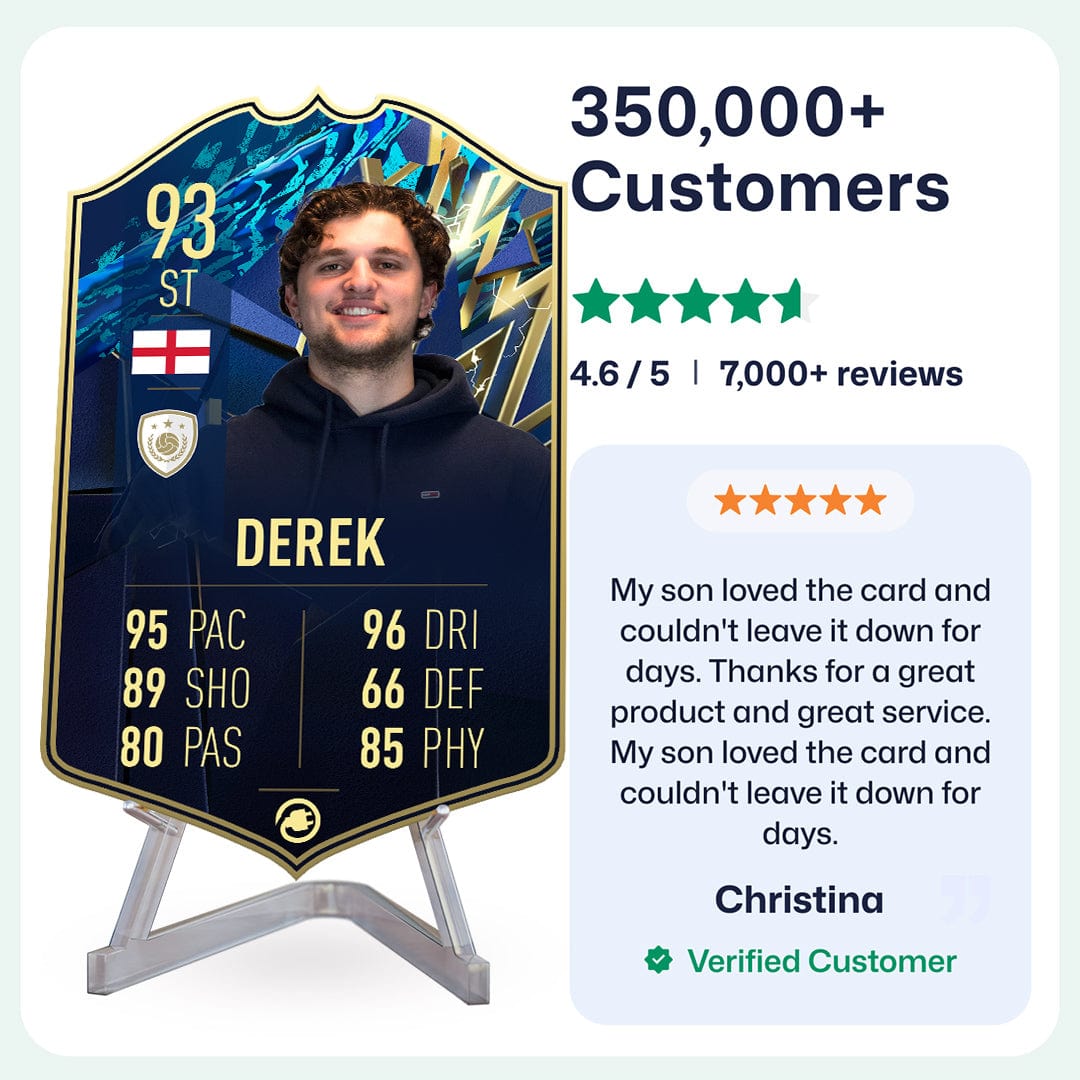 Yes! Our football card designers will remove the background from the photo you upload so it looks just like the football cards you might’ve seen games like EA FC 25, EA FC 24 or FIFA. We’ll also position the photo perfectly on the football card so it looks great. If there are any problems with the quality of your photo, we’ll reach out and let you know. Plus, our website's AI will remove the background on the image for visual purposes before purchase so you can see it without a background on the card.