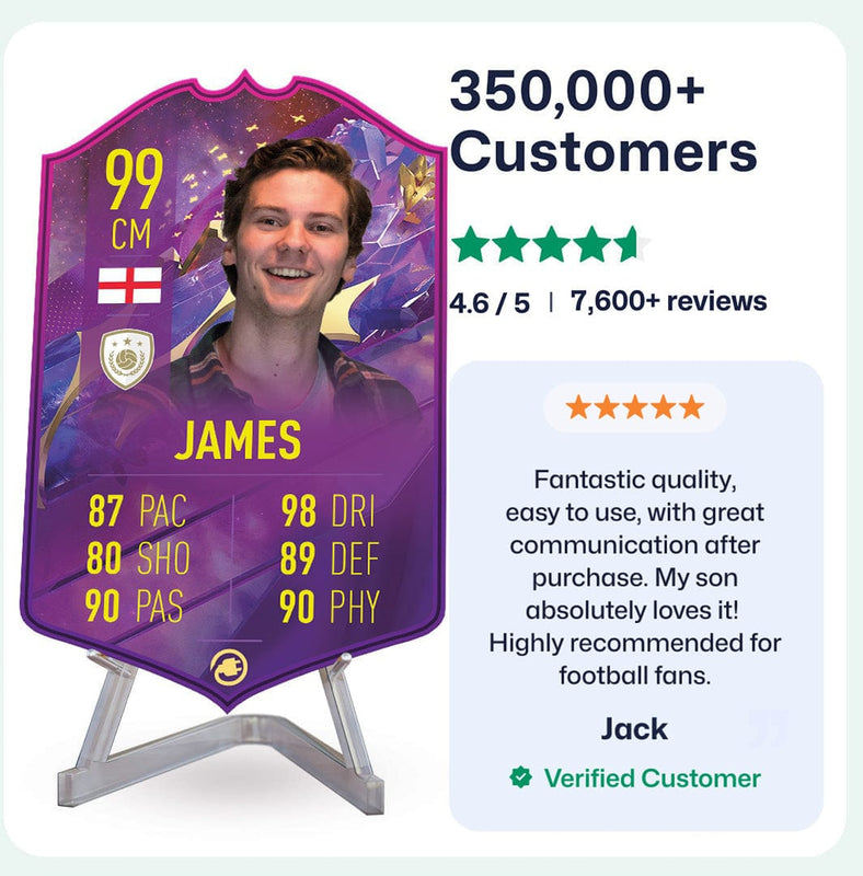 Once you’ve personalised your card, our design experts will edit your photo, design your card, and bring it to life in stunning quality. You’ll get a full preview before we print your card and every card’s quality is backed by our Gold Standard Guarantee. So far, over 350,000+ football fans agree: A CardsPlug football card is the ultimate football gift!