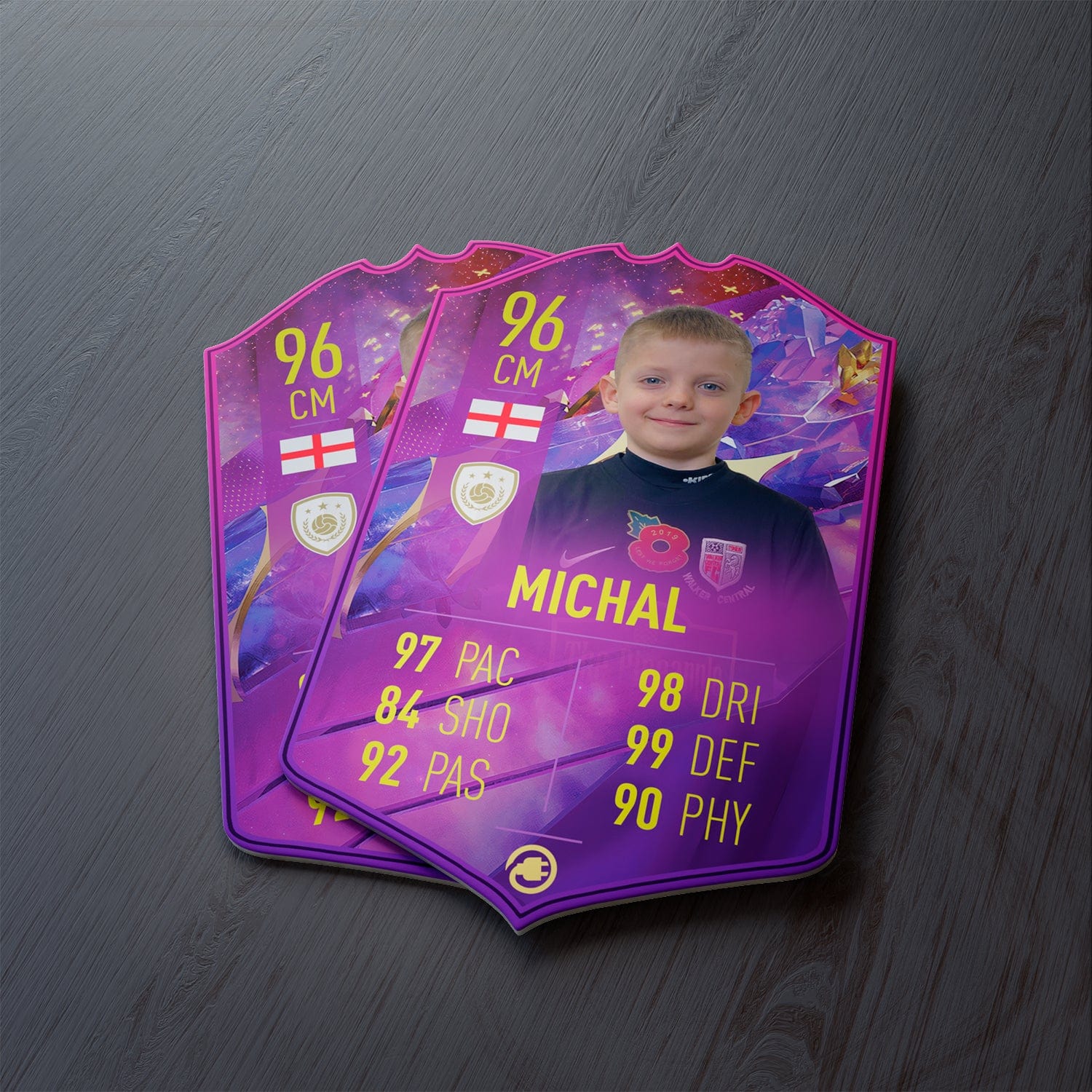 When it comes to personalising your card, the basic steps are to upload a photo and add a name to your card. Then you’ll add details like your player’s position and skill ratings out of 99 for each football skill shown on the card. Our online card builder makes this really easy. And if you aren’t a football card expert, don’t worry!