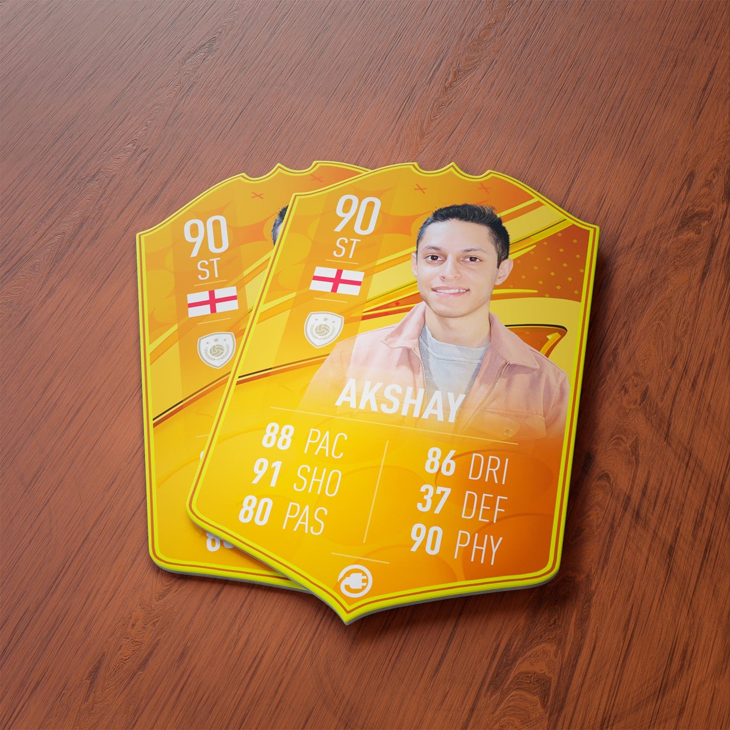 Our football card builder lets you choose between two different card materials. Our Standard cards are made of a ultra-strong variety of Foamex (not cardboard or foam!). This material has a lovely gloss finish and is also super durable. Our world-exclusive Metal football cards have a matte finish and are slightly heavier. Both look amazing and will last forever.